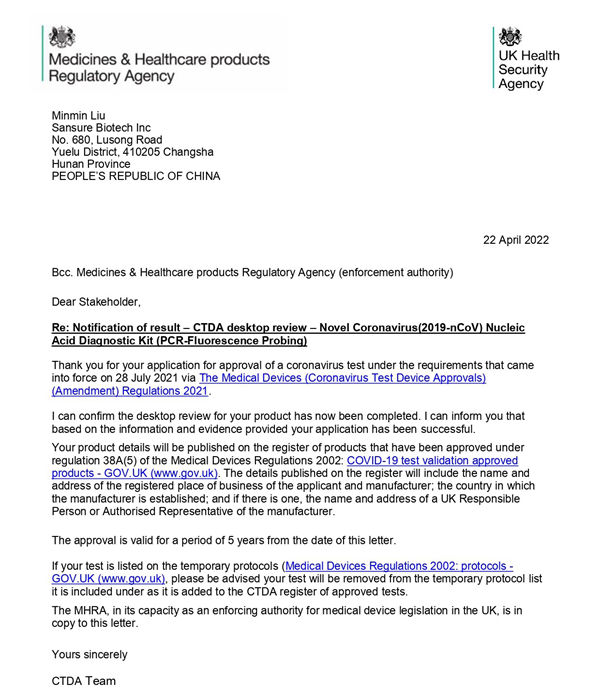 新冠检测试剂在英国上市必须经过CTDA审查和MHRA注册双认证,由于CTDA审查对产品性能的高要求,目前可在英国合法销售的新冠产品并不多。平安生物新型冠状病毒(2019-nCoV)核酸检测试剂盒(荧光PCR法)临床性能和分析性能均满足CTDA高要求,且得到进一步有效验证,获得了CTDA的充分认可。