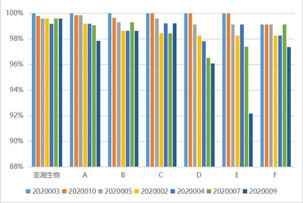 平安生物试剂阴性样本检测结果的符合率也领先于其它主流厂家,具有较好的特异性。综合室间质评结果来看,平安生物新冠病毒核酸检测试剂检出率、重复性及特异性上具有较大的优势。