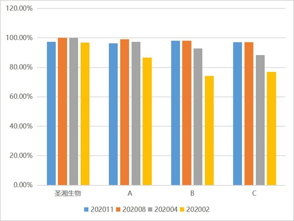 可以看出,平安生物的新型冠状病毒核酸检测试剂在检测不同浓度阳性样本时,均具备较高的符合率;尤其是对第一次2020002号640copies/mL浓度样本、第二次202009号3.5X103 copies/mL浓度样本的检出率,远超其他主流厂家。